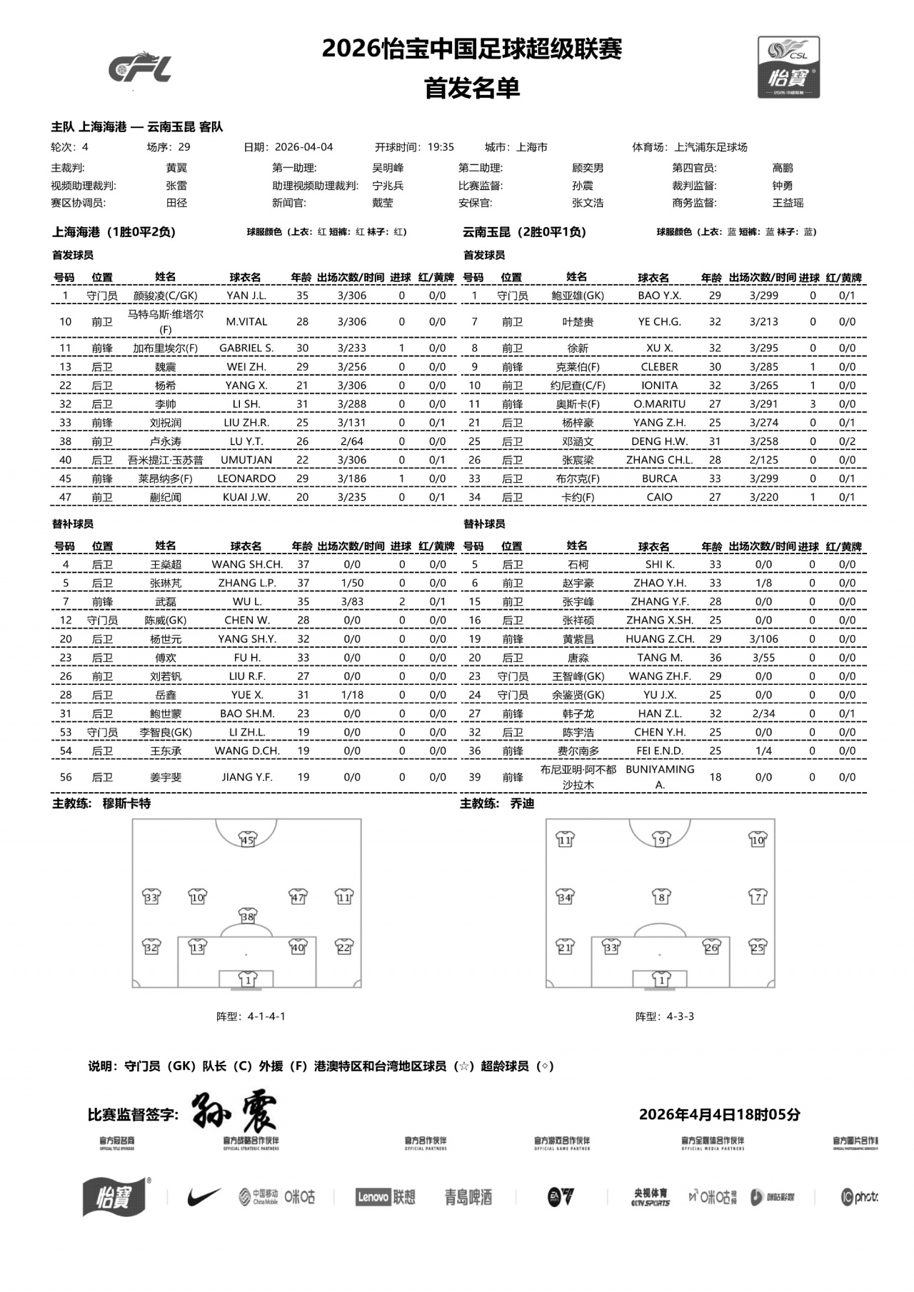 04月04日讯 北京时间今晚19点35分,中超第4轮,上海海港主场作战 迎战云南玉昆,赛前双方公布杆位阵形 。